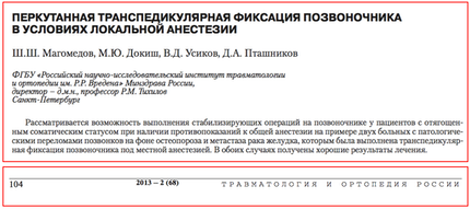 10. Магомедов Ш.Ш., Докиш М.Ю., Усиков В.Д., Пташников Д.А. Перкутанная транспедикулярная фиксация позвоночника в условиях локальной анестезии. Травматология и ортопедия России. 2013; (2): 99-104.