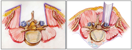 При открытом способе фиксации позвоночника транспедикулярной конструкцией через срединный доступ осуществляется скелетирование остистых и суставных отростков, дужек позвонков. Устанавливается ретрактор (Рис. 1А). Результатом возникающих при этом ишемии и нарушения сегментарной иннервации может быть денервационно-ишемическая атрофия паравертебральных мышц [2]. Таким образом, повреждается очень важный функциональный элемент.
